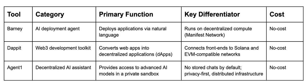 Decentralized architecture is becoming increasingly relevant as developers seek alternatives to centralized cloud providers and data-dependent AI systems. By distributing compute, reducing single points of failure, and prioritizing user control, these systems offer a more resilient and privacy-aligned foundation for modern applications. Tools like Barney, Dappit, and Agent1 reflect a broader move toward freely accessible infrastructure, lowering the barrier to entry for developers exploring AI-native and decentralized workflows.